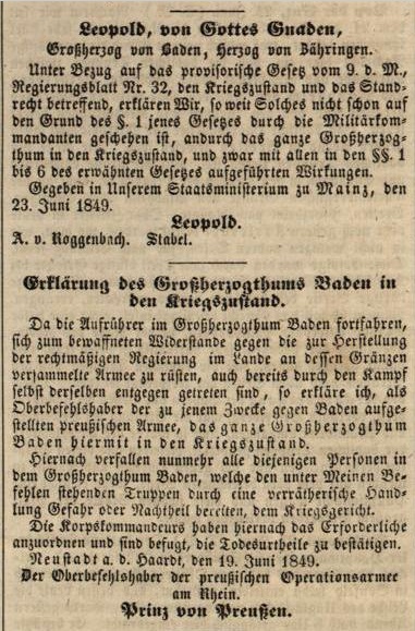 Zeitsplitter 27.06.1849 Veröffentlicht am27.06.201725.06.2017AutorChr. BastertHinterlasse einen Kommentar Die Revolution ist vorbei, am 23.07.1849 wurde Rastatt eingenommen, der Großherzog wieder im Amt. Es wird der Kriegszustand erklärt, sowohl vom Fürsten, als auch vom Prinz von Preußen als Oberbefehlshaber der Operationsarmee. Quelle: https://digital.blb-karlsruhe.de/blbz/periodical/pageview/1787394 Share on FacebookTweetFollow usSave