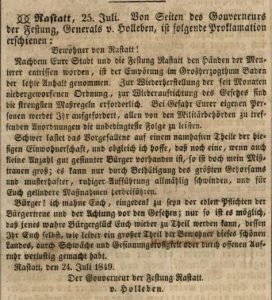 Zeitsplitter 27.07.1849 Veröffentlicht am27.07.201714.07.2017AutorChr. BastertHinterlasse einen Kommentar Ob die Zustände vor der Revolution wirklich „Bürgerglück“ waren? Anordnung des neuen Kommandanten von Rastatt. Quelle:https://digital.blb-karlsruhe.de/blbz/periodical/pageview/2505779 Share on FacebookTweetFollow usSave