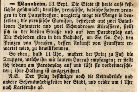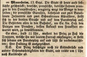 Zeitsplitter 15.09.1849 Veröffentlicht am15.09.201815.10.2017AutorChr. BastertHinterlasse einen Kommentar Auch nach der Revolution ist schwarz rot gold nicht verpönt, selbst wenn der Prinz von Preußen nach Mannheim kommt. Quelle:https://digital.blb-karlsruhe.de/blbz/zeitungen/periodical/pageview/2505812 Share on FacebookTweetFollow usSave