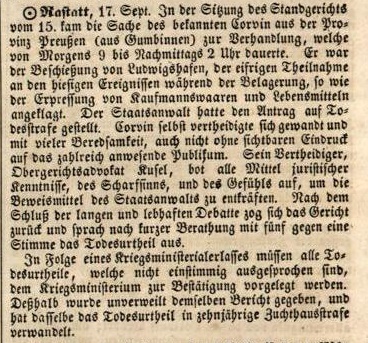 Zeitsplitter 18.09.1849 Veröffentlicht am18.09.201815.10.2017AutorChr. BastertHinterlasse einen Kommentar Bericht über die Verhandelung über Otto von Corvin, der die Festung Rastatt an die Preußen übergab. Link zu Ihm: https://de.wikipedia.org/wiki/Otto_von_Corvin Quelle:https://digital.blb-karlsruhe.de/blbz/periodical/pageview/2505824 Share on FacebookTweetFollow usSave