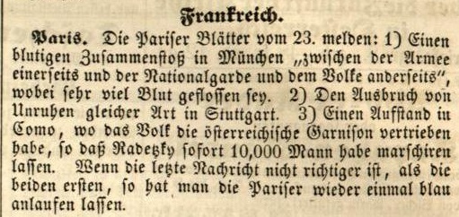 Zeitsplitter 26.10.1848 Veröffentlicht am26.10.201820.09.2018AutorChr. BastertHinterlasse einen Kommentar Falschmeldungen, auch damals schon ein Problem… Und kurioses über einen Preussenverein in Halle… Quelle:https://digital.blb-karlsruhe.de/blbz/periodical/pageview/1627957 Quelle:https://digital.blb-karlsruhe.de/blbz/periodical/pageview/1627957 Share on FacebookTweetFollow usSave